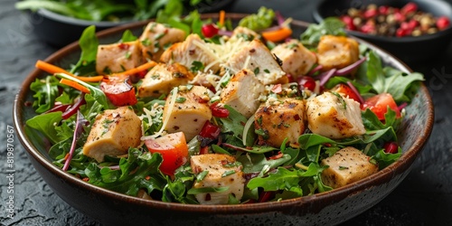 A delectable Caesar salad featuring grilled chicken fillet, fresh romaine lettuce, and savory Parmesan.