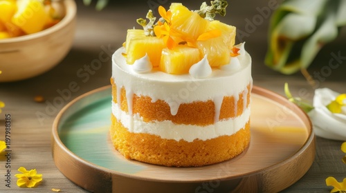 A Delectable Pineapple Cake with Whipped Cream and Fresh Pineapple Slices. A Perfect Sweet Treat for Any Occasion, Showcasing Exquisite Cake Decoration