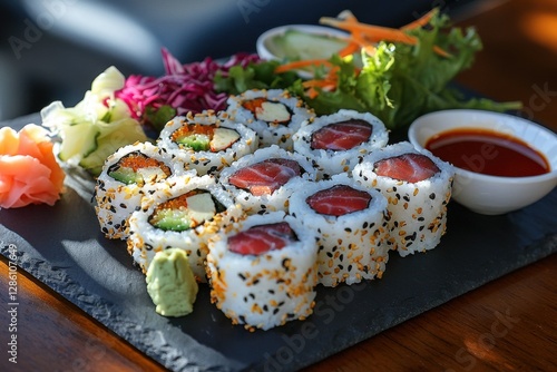 A delectable sushi platter featuring tuna rolls with sesame seeds, ginger, and a side of soy sauce, garnished with fresh greens and wasabi on a dark stone surface.
