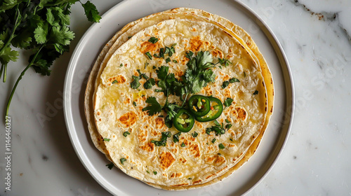 A delectable tortilla showcases a vibrant blend of flavors, garnished with fresh cilantro and sliced jalapeno, inviting indulgence in every bite