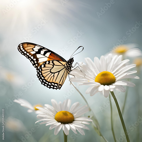 A delicate butterfly perched on a daisy, with soft sunlight illuminating the scene, creating a peaceful and serene atmosphere in nature.