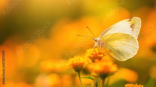 A delicate butterfly rests on bright yellow flowers, surrounded by lush greenery, under the warm glow of the afternoon sun