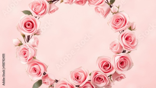 A delicate circle of pink roses arranged on a soft, pale pink background, creating a romantic and elegant floral frame.