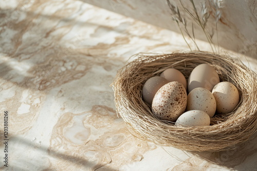 A delicate composition of speckled eggs resting in a natural straw nest. The soft contrast of light and texture brings a sense of warmth, nostalgia, and springtime renewal.