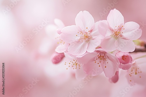 A delicate display of pink cherry blossoms in soft focus creating a serene and dreamy springtime scene
