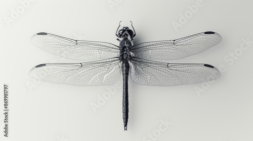 A delicate dragonfly, with intricately detailed wings, is captured in minimalist black lines on a white background