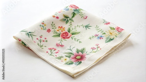 A delicate, intricately illustrated handkerchief with a floral pattern and subtle texture, presented in a minimalist composition on a soft, creamy white background.