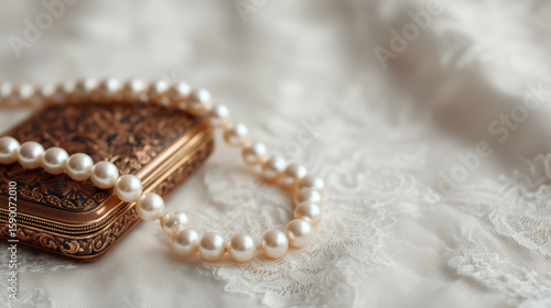 A delicate pearl necklace elegantly draped over an intricately designed vintage jewelry box on soft lace fabric.