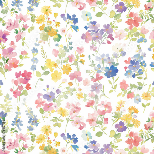 A delicate watercolor pattern of assorted blooms and foliage in pastel hues.