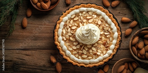 A delicious almond pie topped with whipped cream, surrounded by almonds on a wooden table.