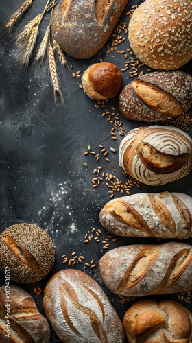 A delicious assortment of artisan bread lay on a rustic table, each loaf beautifully crafted and displaying textures and patterns ideal for a bakery feature.