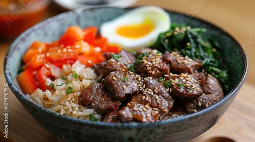 A delicious bowl of beef, rice, vegetables, and a soft-boiled egg, garnished with sesame seeds.