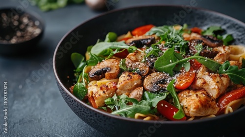 A delicious dish featuring grilled chicken, sautéed mushrooms, fresh arugula, cherry tomatoes, and pasta presented in a dark bowl with a rich, vibrant color palette.