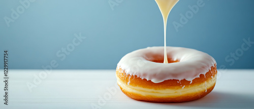 A delicious donut with a glossy icing drizzling down, set against a clean blue background.