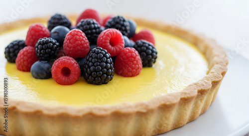 A delicious lemon tart with a golden crust is topped with a colorful mix of fresh blueberries, raspberries, and blackberries.