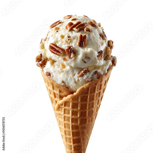 A delicious pecan praline ice cream cone isolated on a clean white background