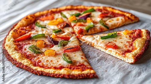 A delicious pizza topped with colorful vegetables, featuring a golden crust and melted cheese, perfect for any meal.