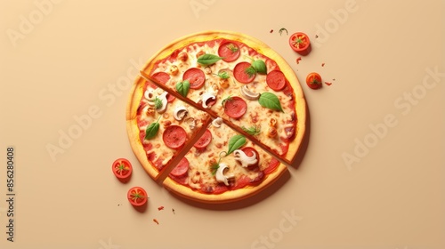 A delicious pizza with pepperoni, mushrooms, basil, and tomatoes. The pizza is cut into slices and arranged on a beige background.
