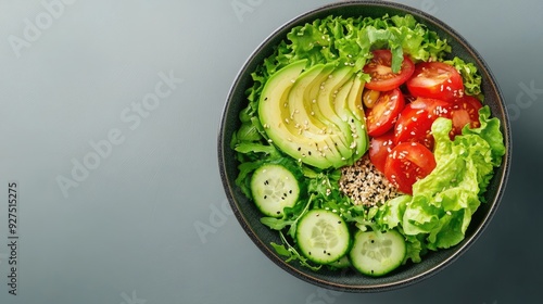 A delicious salad bowl with avocado, tomato, and cucumber, captured in a flat lay style on a sleek grey background.