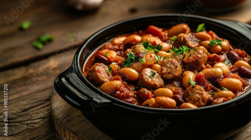 A delicious sausage and beans casserole is simmering in rich tomato sauce, garnished with fresh herbs, presented in a black bowl on a rustic wooden table