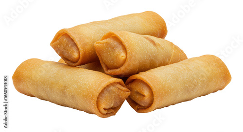 A delicious stack of crispy spring rolls on a clean surface ready for serving isolated on white background