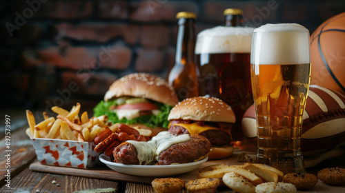 A delightful assembly of burgers, sausages, fries, and beers, next to a basketball and football, creating an atmosphere of casual dining and sports enjoyment.