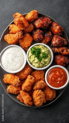 A delightful assortment of mouthwatering chicken wings presented on a dark, textured plate, accompanied by a selection of flavorful dipping sauces