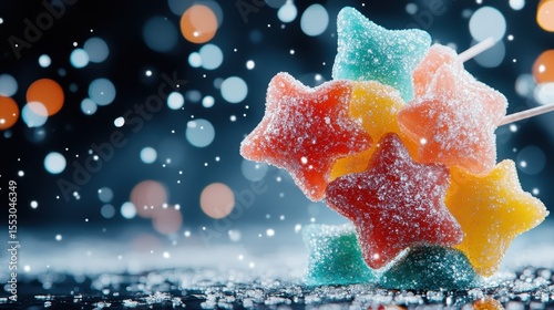 A delightful assortment of star-shaped candies, glistening against a blurred sparkling backdrop, creates a whimsical and vibrant atmosphere, perfect for evoking joyful memories.