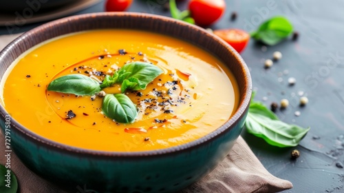 A delightful bowl of creamy soup, exquisitely presented against a colorful background, inviting a taste of its rich flavor