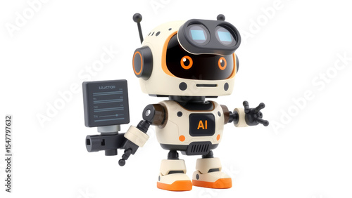A delightful kawaii-style cartoon robot, dressed as an AI researcher with profession-specific tools, presented in a clean vector design.
