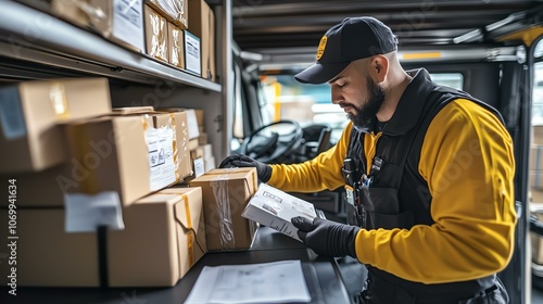 A delivery worker organizes packages inside a vehicle, checking items against paperwork while ensuring accurate distribution.
