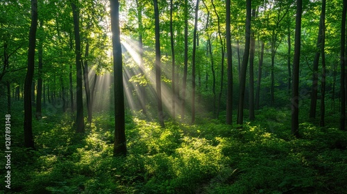 A dense evergreen forest with thick tree trunks, lush undergrowth, and soft beams of sunlight shining through the canopy.