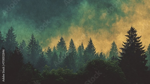A dense forest at dusk, contrasted by a warm orange glow in the sky.
