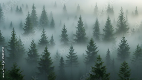 A dense forest of evergreen trees is shrouded in a thick, ethereal mist, creating a serene and atmospheric scene.