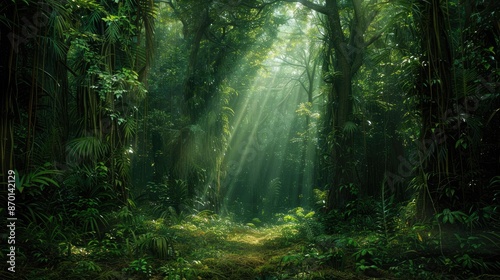 A dense forest with a single ray of sunlight piercing through the canopy, highlighting hope in darkness.
