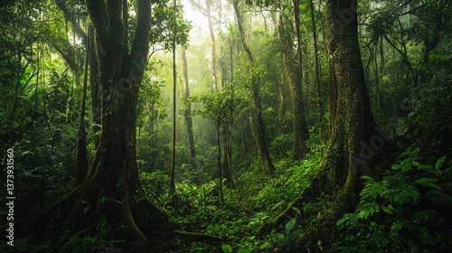 A dense jungle filled with towering trees, their branches covered in thick vines and moss