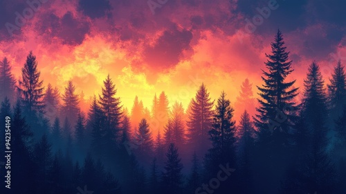 A dense pine forest at sunset, with the sky ablaze with color and the treetops silhouetted against the light.