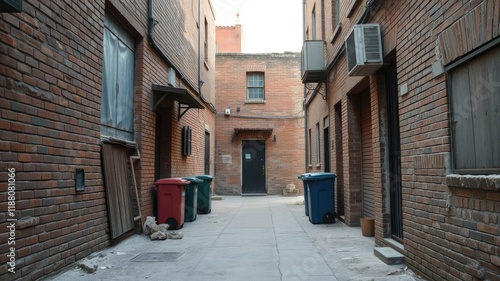 A deserted alleyway with old bricks and trash cans, abandoned, cans