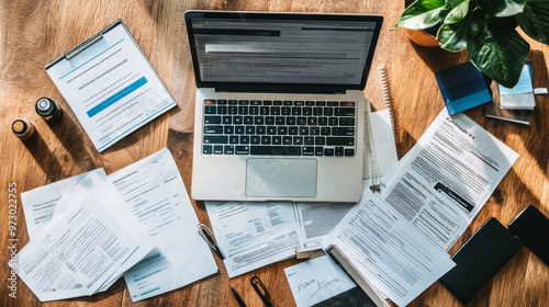 A desk filled with paperwork, contracts, and a laptop displaying successful monetization strategies for content creators