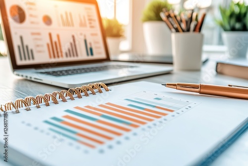 A desk setup with a laptop screen showing an online marketing campaign. Generative AI
