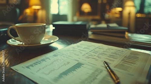 A desk with documents, a pen, and a cup of coffee, suggesting a work or study environment.