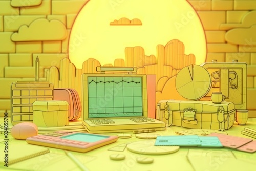 A detailed 3D artwork of a business meeting scene with financial management tools like a pie chart