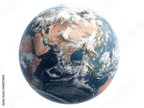 A detailed 3D rende of planet Earth showcasing continents oceans and cloud formations against a pure white background.