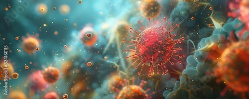 A detailed 3D render of hepatitis viruses attacking liver cells, Futuristic, Red and Yellow Hues, Digital Art, Emphasizing viral invasion