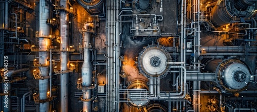 A detailed aerial shot of an industrial complex featuring intricate piping and machinery, illuminated with warm lights during nighttime.