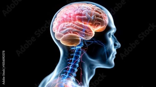 A detailed anatomical illustration of the human brain and spinal cord, highlighting the central nervous system.