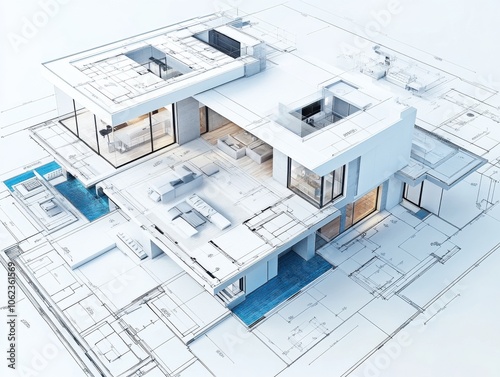 A detailed architectural blueprint of a modern, minimalist house featuring open spaces, large windows, and integrated pools, highlighting innovative design.