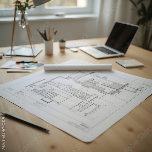 A detailed architectural blueprint unfurls on a light wooden desk alongside a laptop pencil and design tools This bright workspace is ready for creative planning