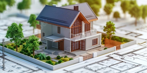 A detailed architectural model of a modern, two-story house with a flat roof, large windows, and a balcony, placed on a white architectural blueprint with a green roof and trees in the background