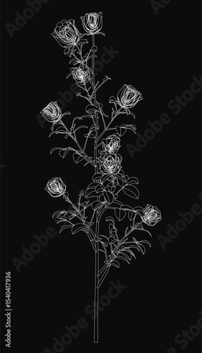 A detailed black and white drawing of a rose bush with intricate petals and leaves, set against a stark black background for high contrast. The monochrome style highlights the delicate textures